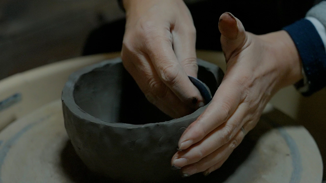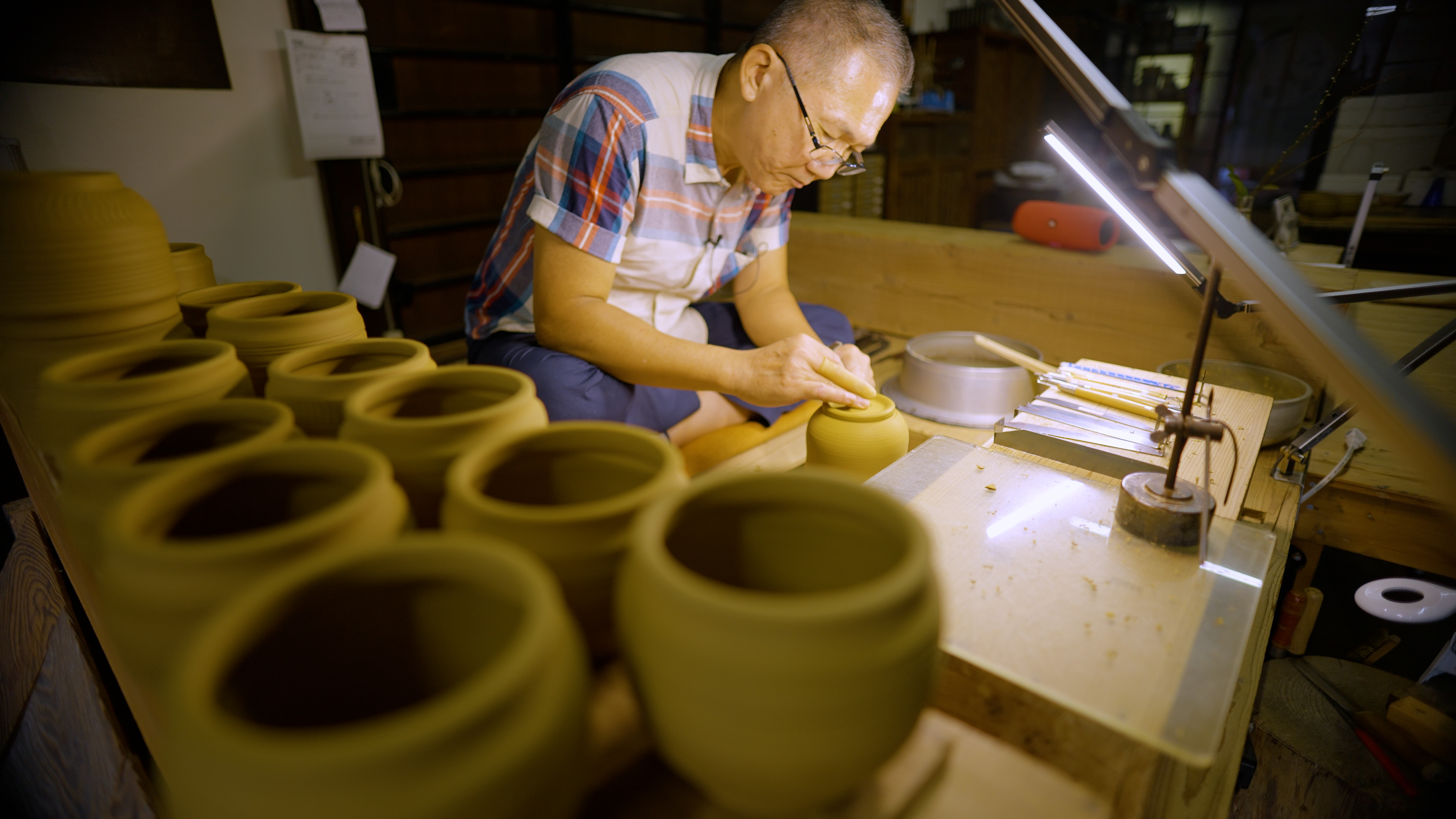 陶器づくりの魅力は、無形の粘土から立体(器)を創り上げていく面白さ、そして暮らしの必需品ともいえる食器や茶器など、人に使ってもらえる喜びを感じられることが一番大きいと語る杉本 遊炫(ゆうげん)さん。古い町屋を利用したやきもの工房も魅力的です。